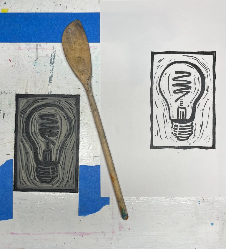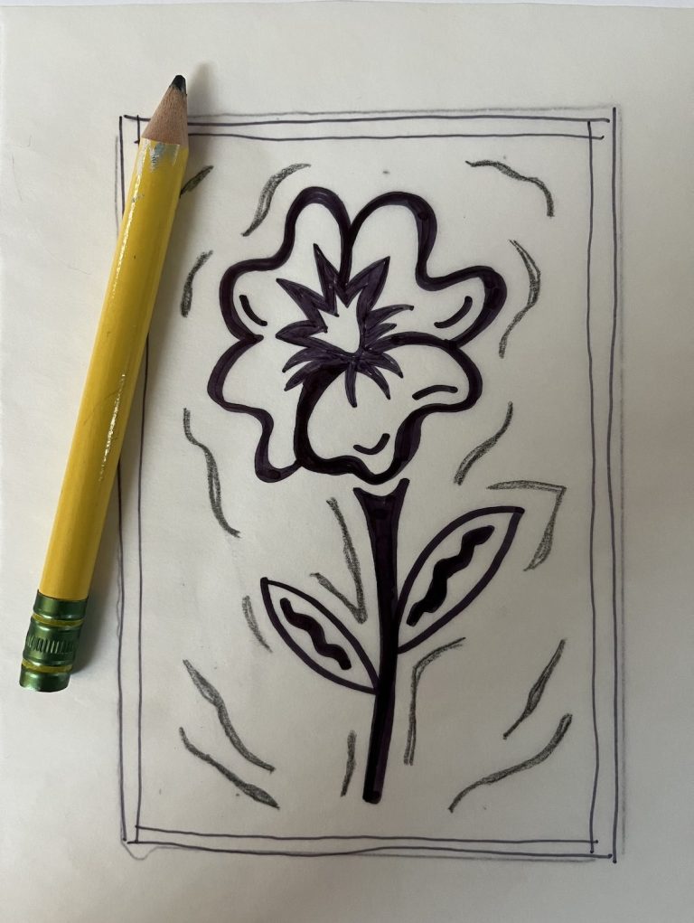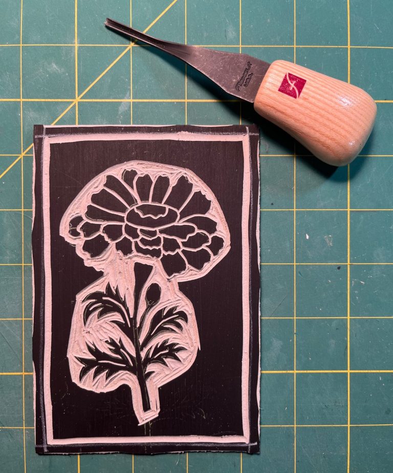 Carving the block is my favorite part of the process! I transfer the sketch to the printing block. Then I hand-carve the design.